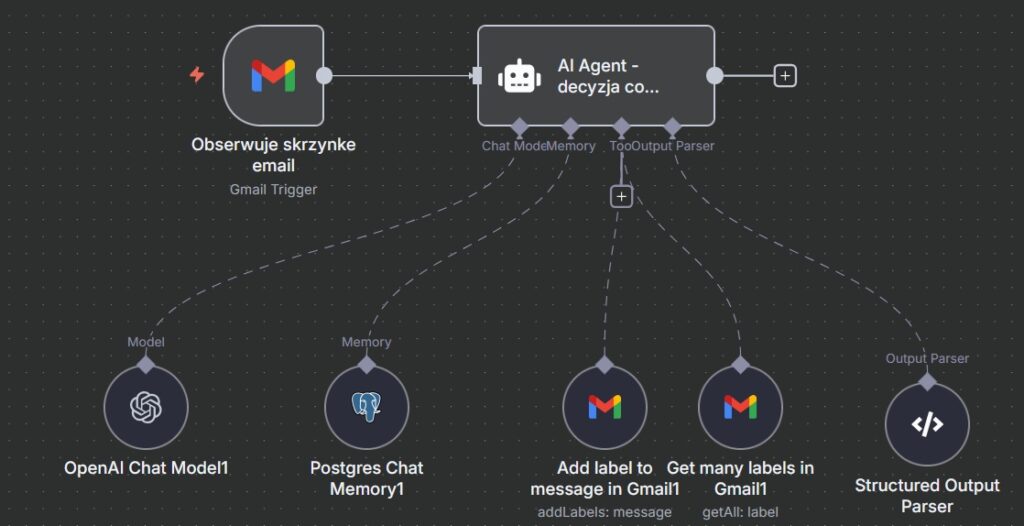 - Połącz z Triggerem: Podłącz węzeł wyzwalający (np. Węzeł Email lub Webhook) do węzła Agent AI.
